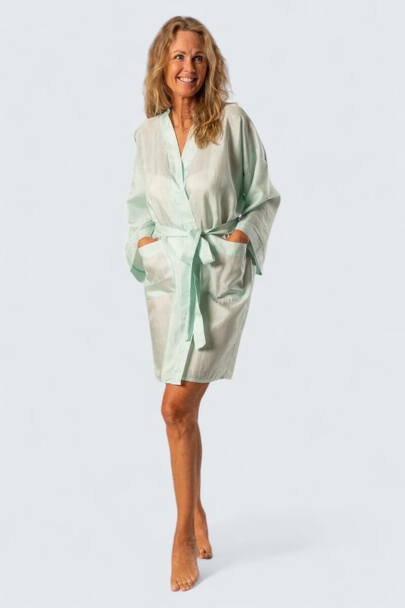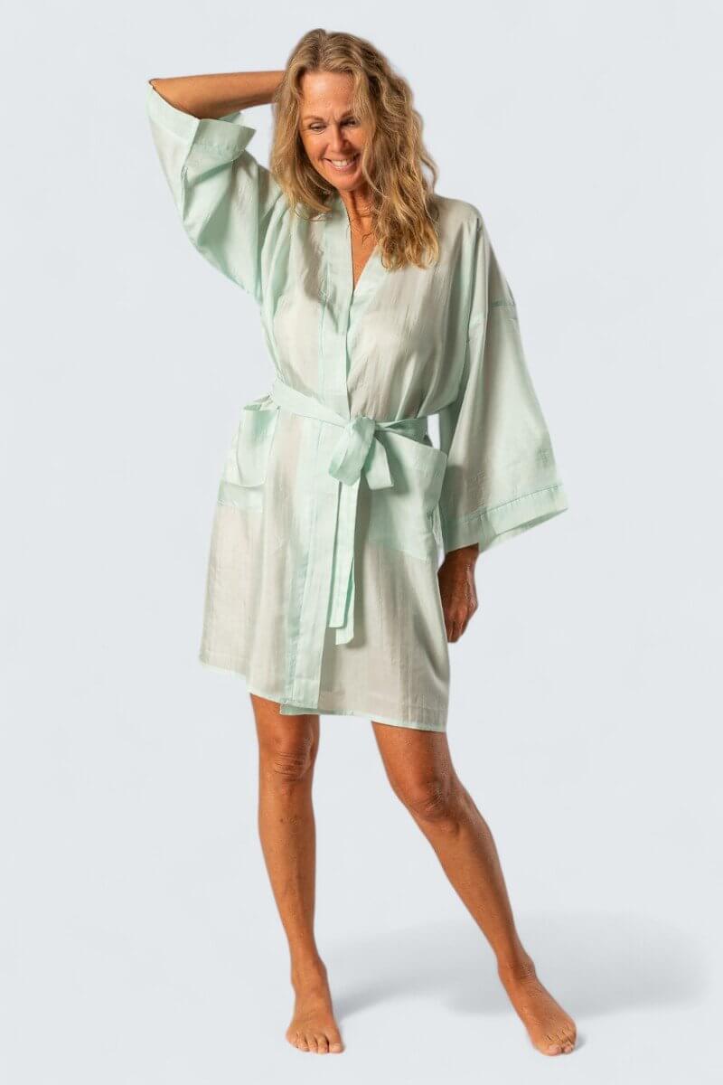 Lätt sidenkimono av kortare modell, 100% siden. Unna dig lyxen av en sidenmorgonrock i siden. Utmärkt på resan men lika ljuvlig hemma. Förpackad i en praktisk liten sidenpåse. Modellen är unisex och passar både kvinnor och män.
