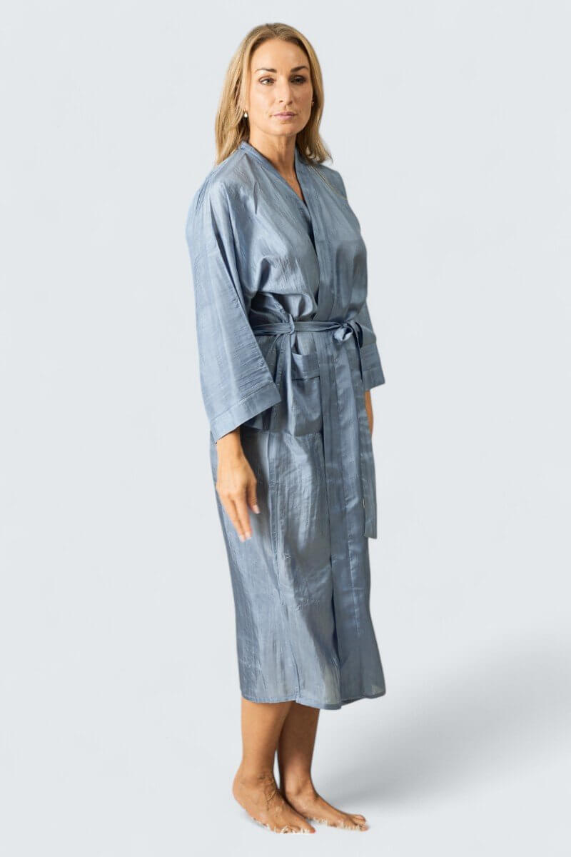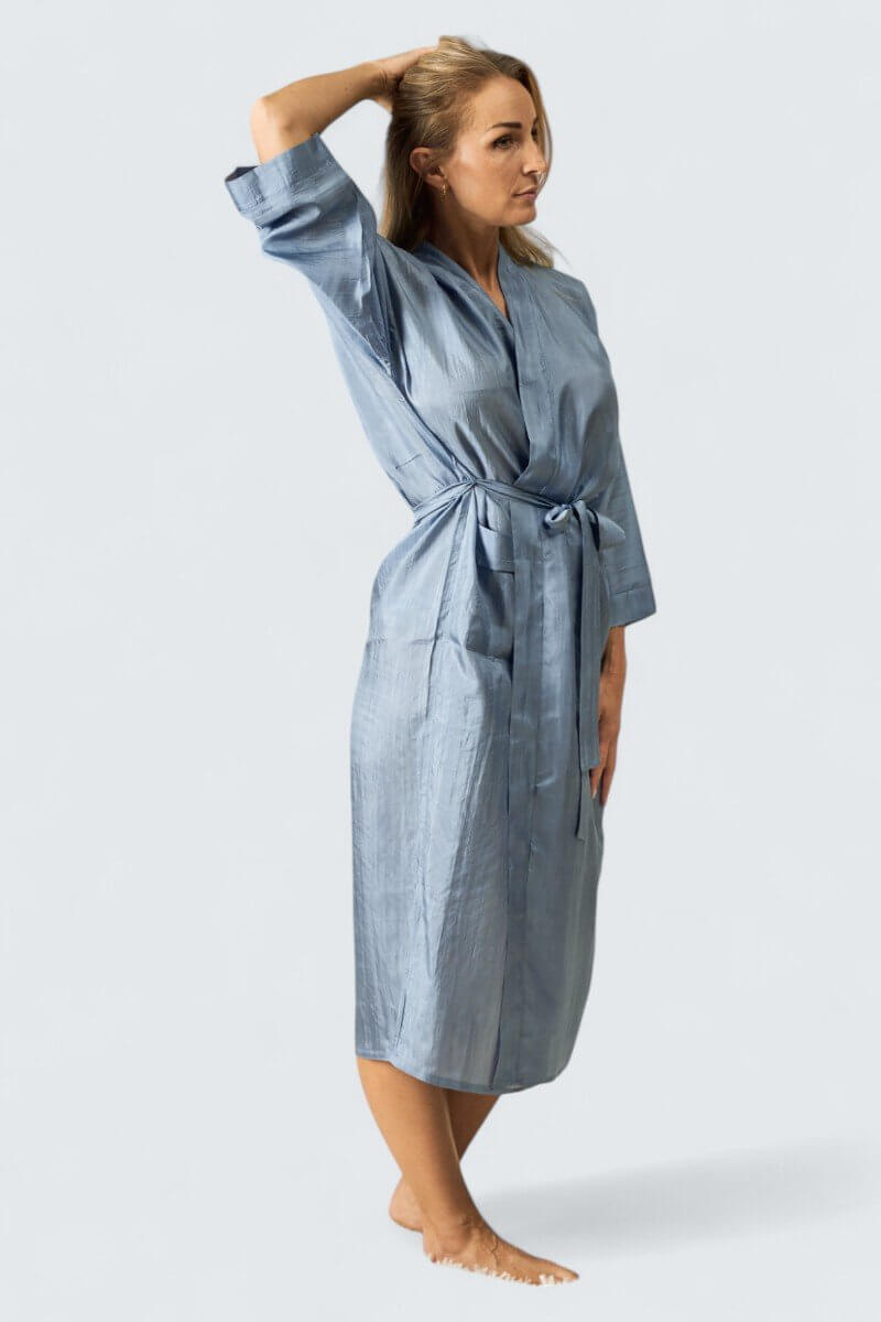 Resemorgonrock i 100% siden. Unna dig lyxen av en morgonrock i siden. Utmärkt på resan men lika ljuvlig hemma. Förpackad i en praktisk liten sidenpåse. Modellen är unisex och passar både kvinnor och män.