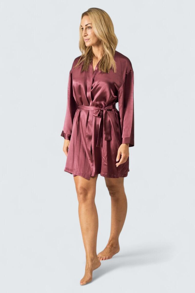 Lyxigt härligt sidenrock/sidenmorgonrock av finaste sidensatin i fin burgundyfärg. Sidenrocken är tillverkad av 100% siden, 16 momme vilket innebär en kraftig och härligt kvalitet. Morgonrocken är av kortare modell, midjeband av färgen Burgundy medföljer. Blir lätt ett favoritplagg att svepa om sig om kvällen eller morgonen!