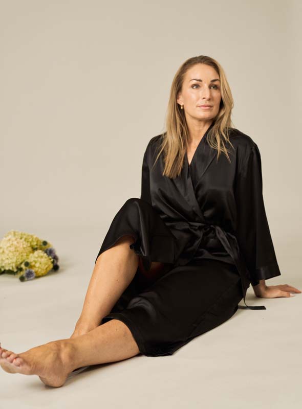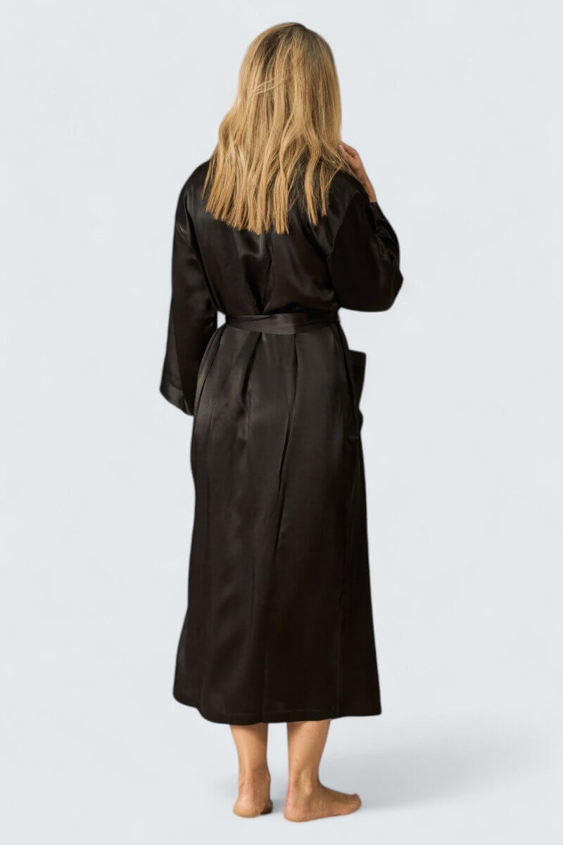 Här har du en sidenmorgonrock av absolut högsta kvaltiet i svart läcker färg. Tillverkat av finaste mullbärsiden och vävd som en satin med sin glansiga lyster och kraftiga känsla. Morgonrocken har fickor framtill och band följer med att knyta om midjan. Morgonrocken är tillverkad av 100% siden.