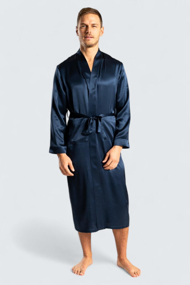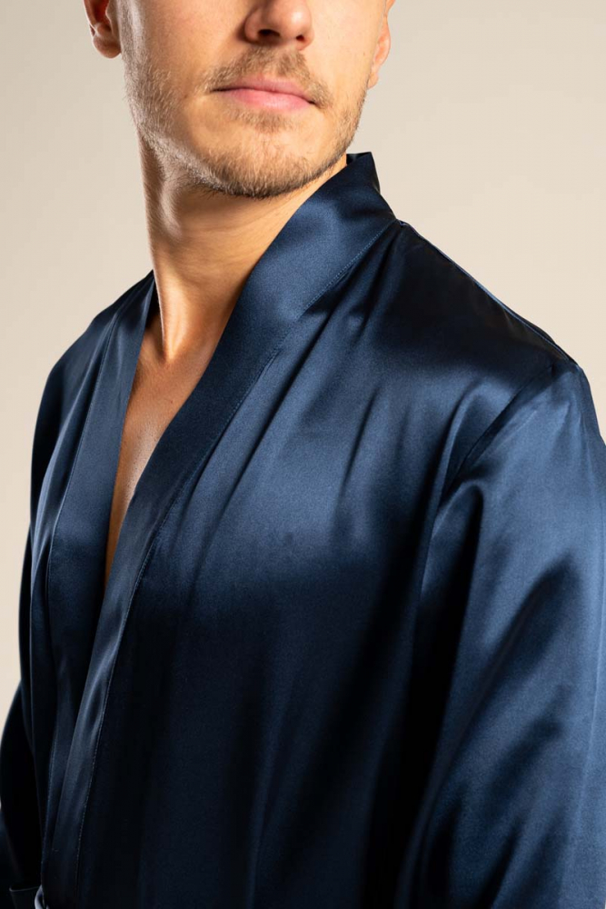 Den klassiska designen med sjalkrage och ett justerbart midjebälte kombinerar komfort med stil, medan den djupa marinblå färgen ger en tidlös elegans. Perfekt att bära efter duschen, under avslappnade hemmakvällar eller som en exklusiv del av din loungewear-garderob.