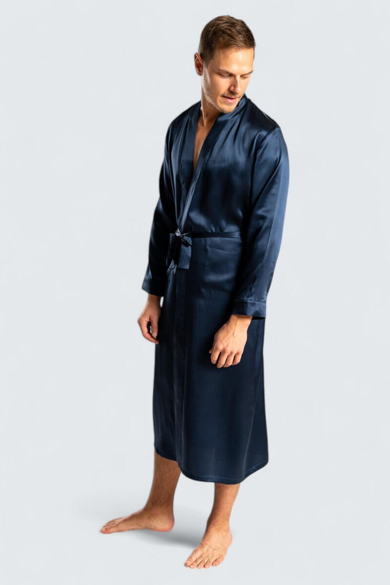 Unna dig den ultimata lyxen med denna eleganta morgonrock i äkta sidensatin. Det naturliga silket ger en oöverträffad mjukhet och en lätt, andningsbar känsla som är perfekt för både varma och kalla dagar. Dess lena och svala yta känns behaglig mot huden, samtidigt som den ger en sofistikerad och exklusiv look.