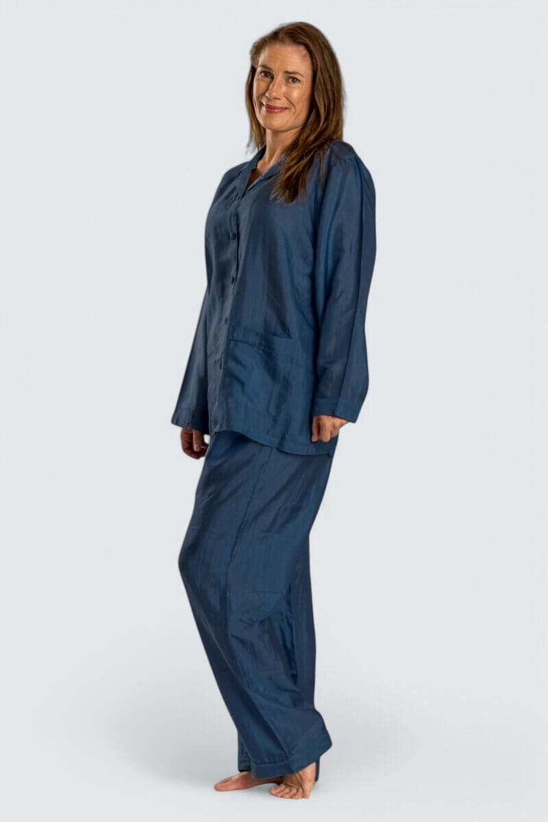 Ljuvligt skön sidenpyjamas med knappar i damstorlekar. Perfekt både för resan eller hemmet. Unna dig lyxen att sova i siden; värmer när det är kallt och svalkar när det är varmt!