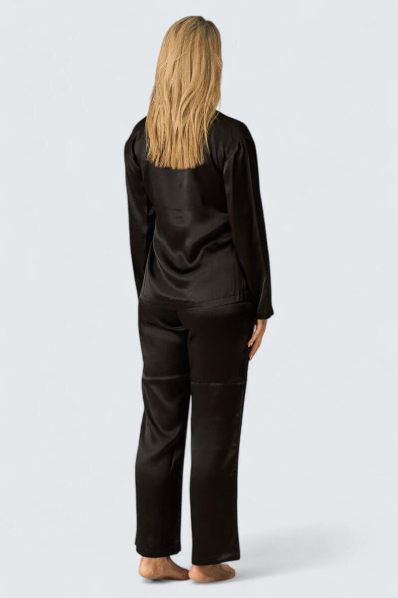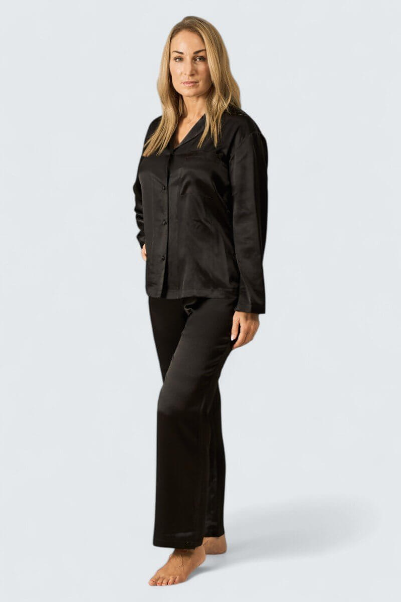 Exklusiv sidenpyjamas av finaste sidensatin. Ger en kraftig och lyxig känsla. Fina detaljer som silkesklädda knappar ton i ton. Plagget ger en unik och lyxig känsla som är svårslagen i denna svarta sensuella färg. Bara att krypa in i pyjamasen och bara njuta av den sköna kvaliteten, perfekt för den som vill unna sig något extra och sätta guldkant på tillvaron.
