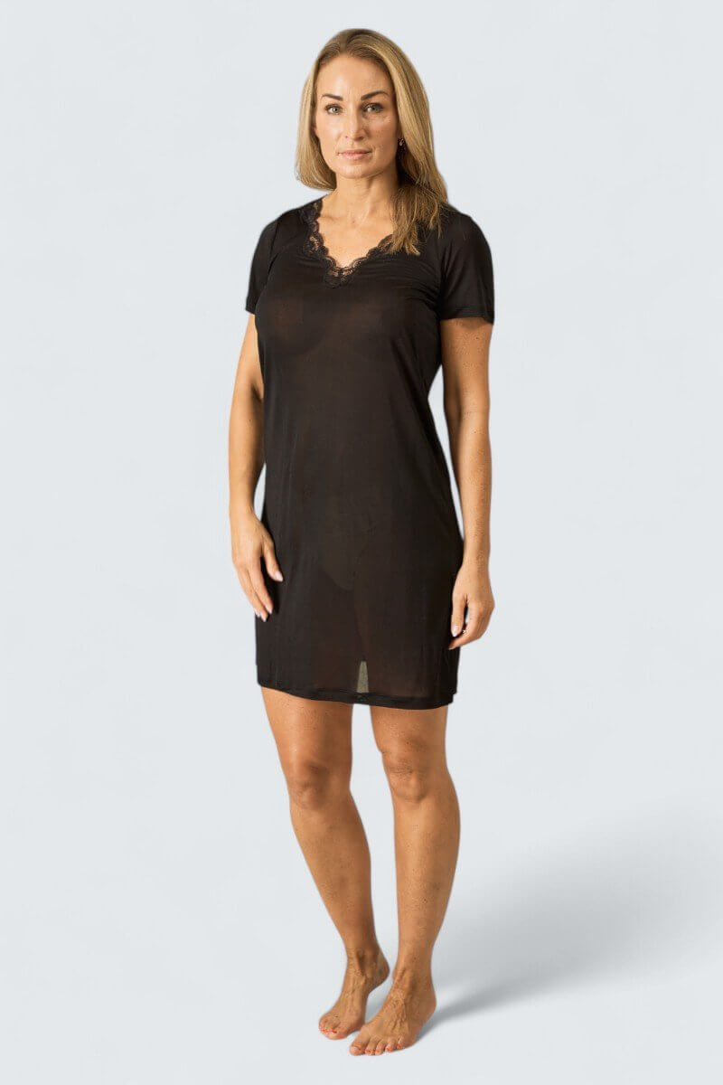 Ljuvligt nattlinne av 100% sidentrikå. Dekorativ spets upptill som gör det extra vackert. Nattlinnet är stretchigt eftersom det är tillverkat av sidentrikå. Då det är tillverkat av siden har nattlinnet naturligt temperaturreglerande egenskaper.