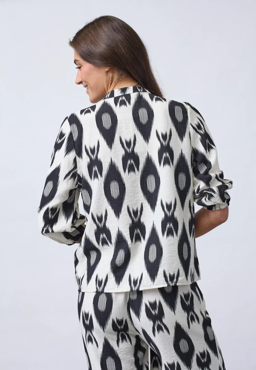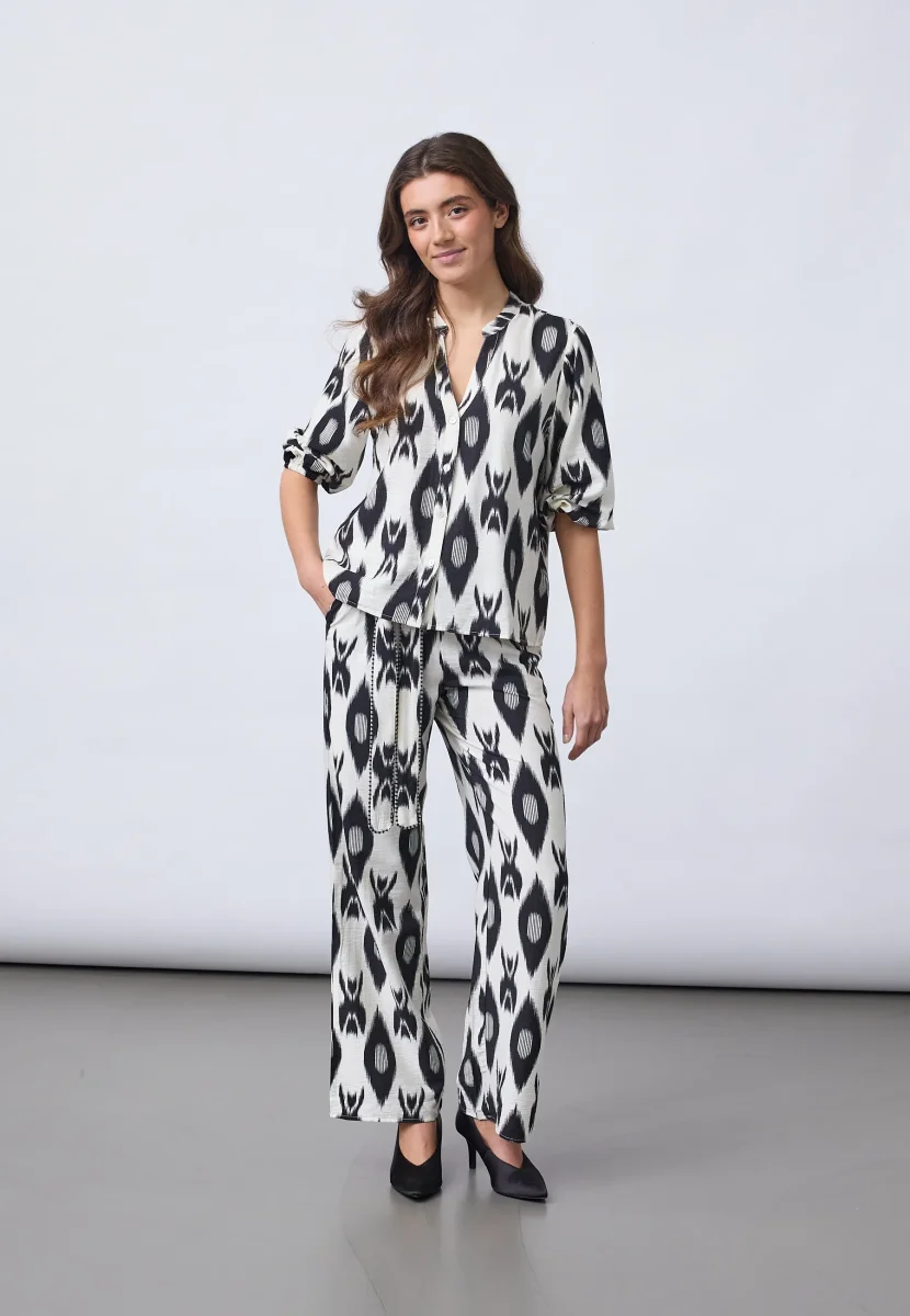 Det mönstrade tyget i svart och ljusa toner gör att skjortan sticker ut samtidigt som den är lätt att matcha. Den passar lika bra till jeans för en vardaglig look som tillsammans med Viaba pants för ett komplett set.