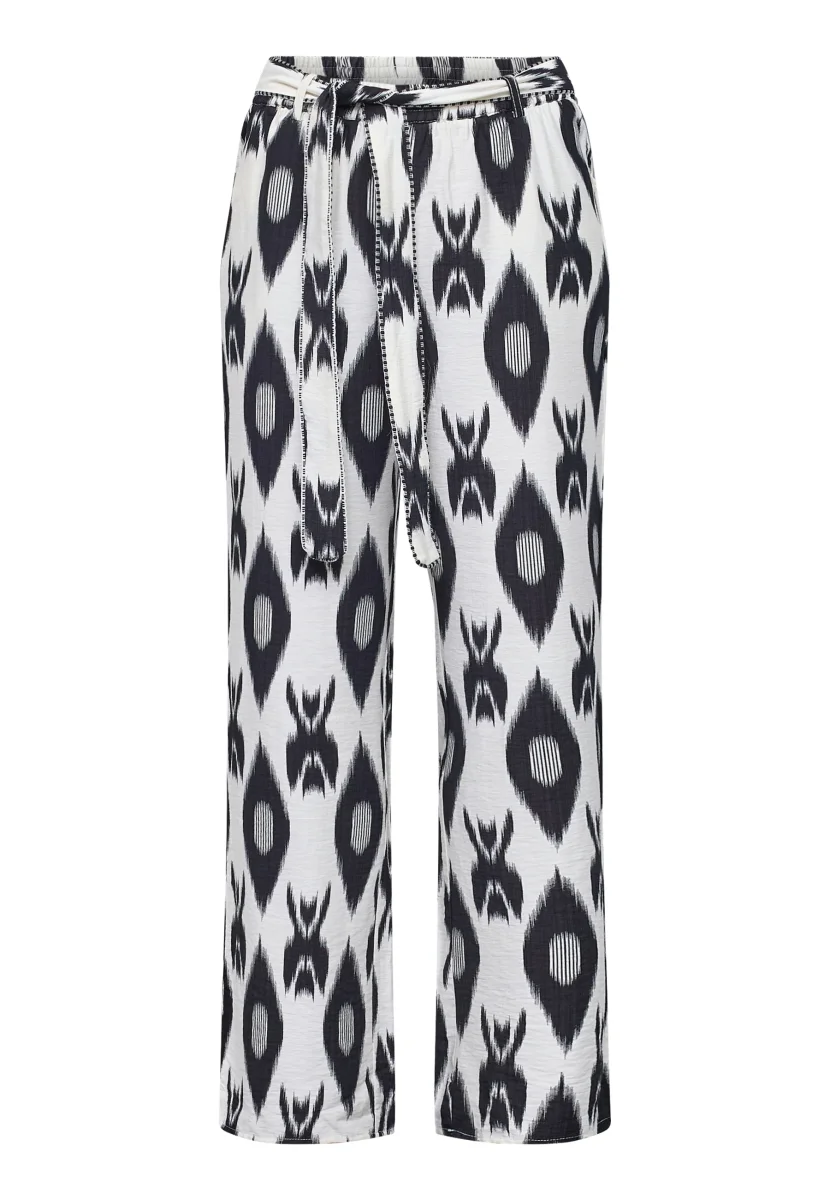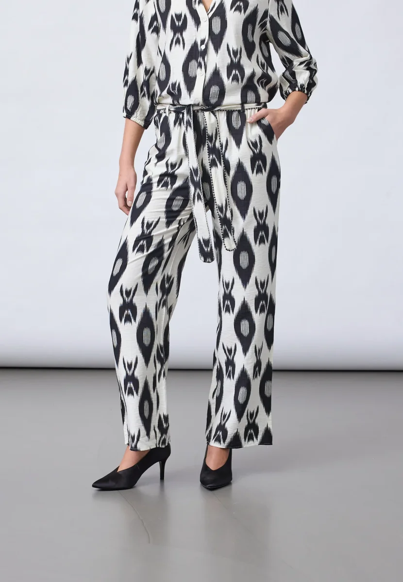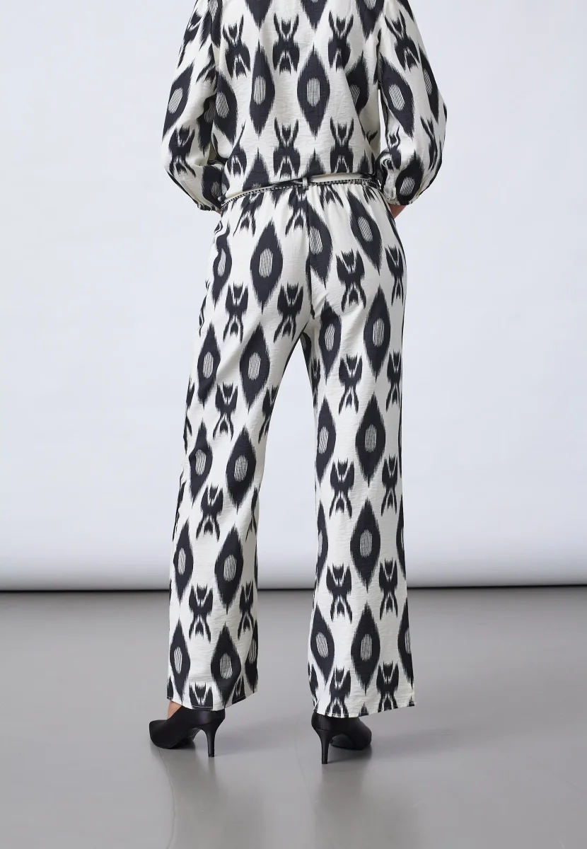 Det mönstrade tyget i svart och ljusa toner gör att byxorna sticker ut och ger liv till outfiten. De passar lika bra till en enkel topp som tillsammans med Viaba shirt för ett komplett och matchande set.