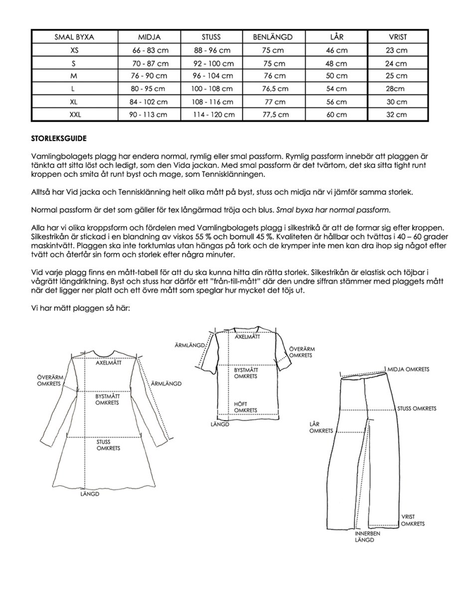 Smal byxa med resår i midjan. Tygkvalitet silkestrikå 63 % viskos och 37 % bomull. Maskintvätt 40 grader.
