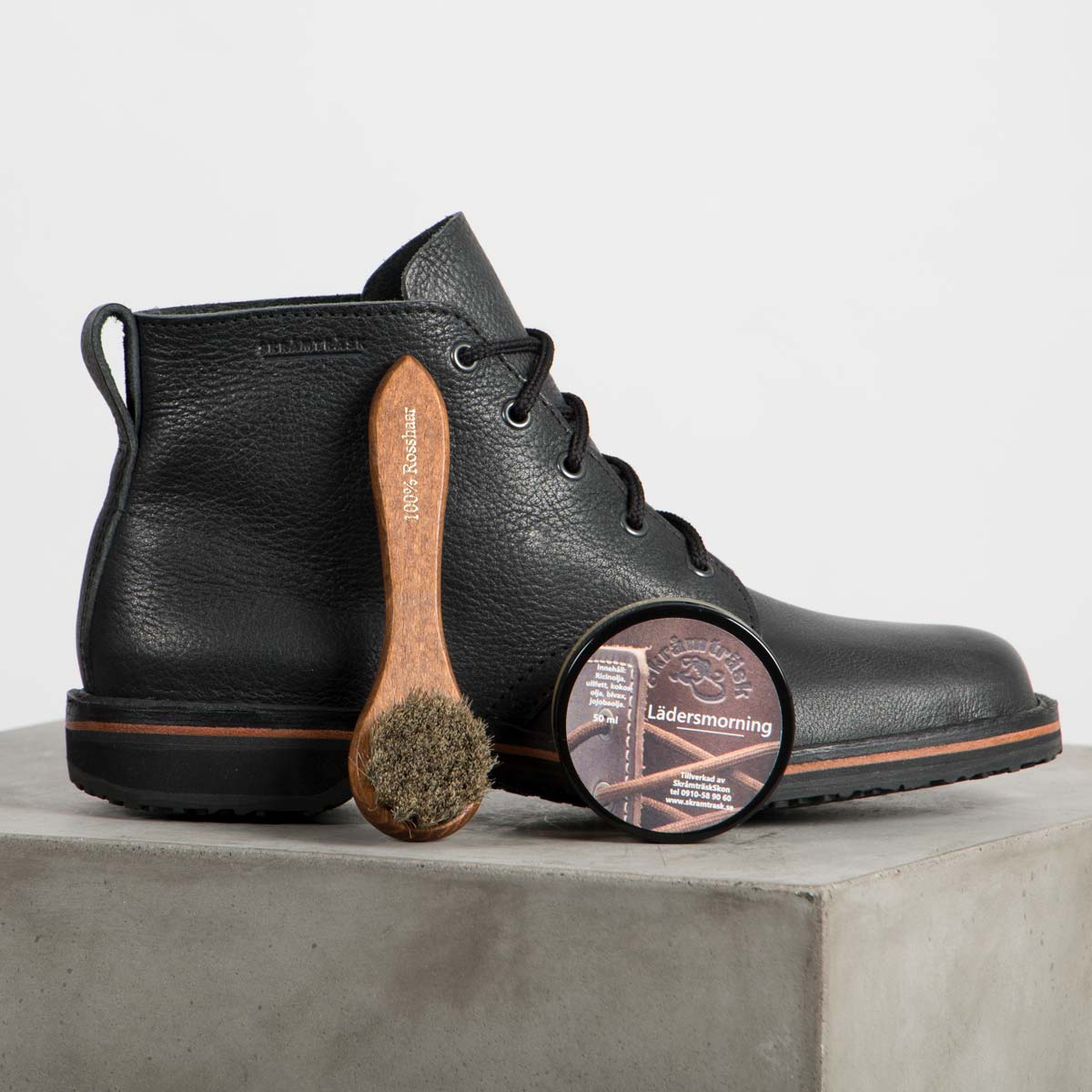 Med varje köp av ett par kängor från Skråmträsk så medföljer ett skovårdskit inkluderande skoborste i 100% hästtagel & Skråmträsk egentillverkade lädersmorning (75ml) till ett värde av 225:-. Vaxet vårdar skinnet & skyddar mot väta samt bidrar till glans utan att förstöra andningsförmågan.
