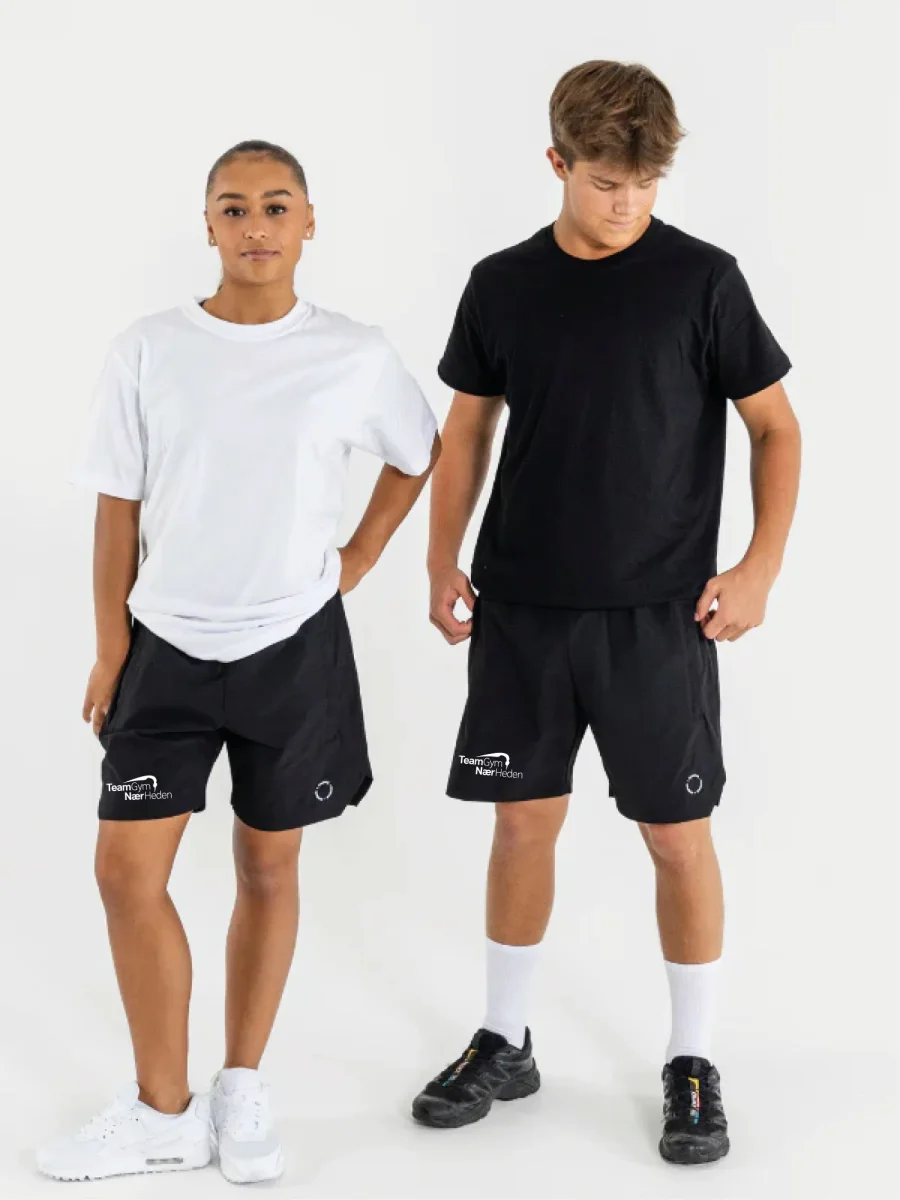 Unisex shorts i vores tech kvalitet. Kvaliteten er strækbar og har et cool outdoor udtryk. Strækket gør shortsene meget anvendelige til gymnastik og andre former for bevægelse. I denne model er der en lynlåslomme på begge sider og en snøre i maven. Da pasformen er unisex, vil vi anbefale at piger tager et nummer mindre end normalt.