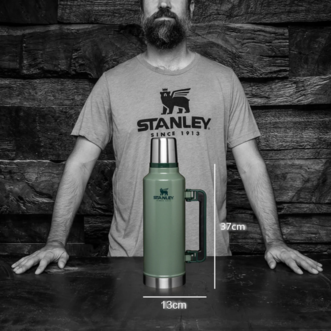 Stanleys klassiska termos i 18/8 rostfritt stål och den ikoniska gröna hammarlacken samt ett rejält handtag. MEGA-stor termos som håller värmen i upp till 45hr. Kall dryck förblir nedkyld i 2 dagar och om du drar ned lite is kan den hålla kylan i över en hel vecka.