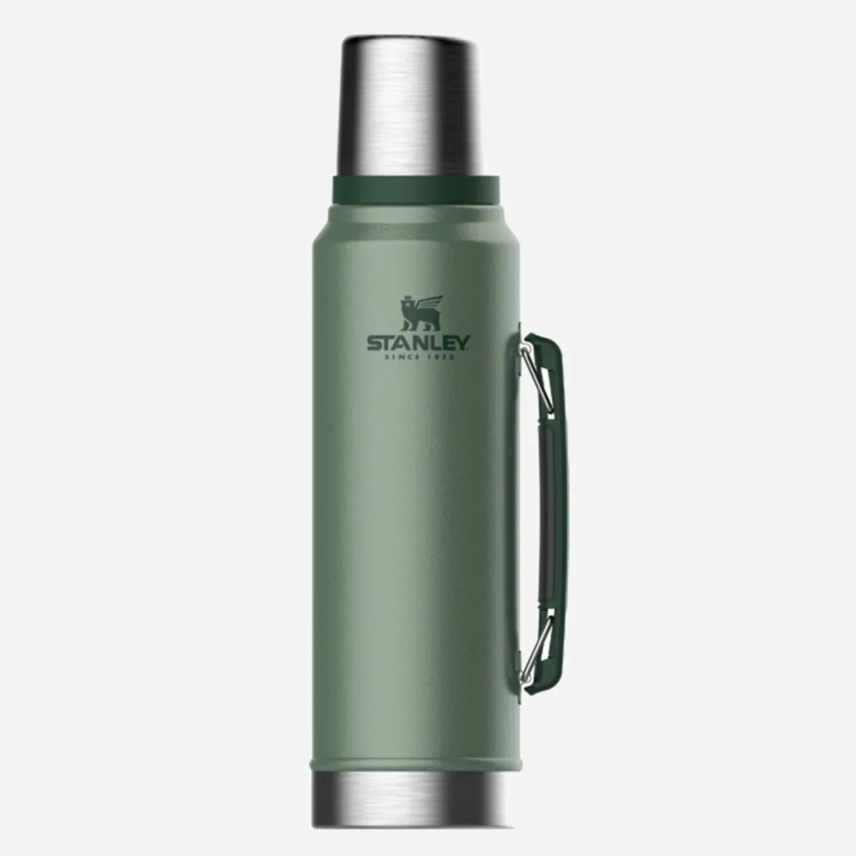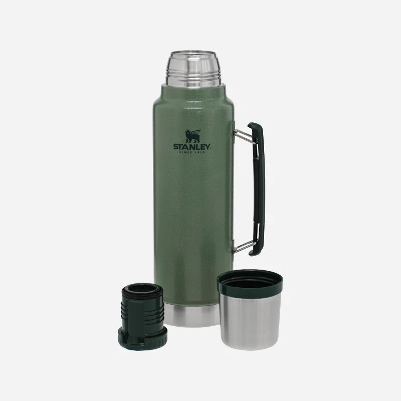 Stanleys klassiska termos i 18/8 rostfritt stål och den ikoniska gröna hammarlacken samt ett rejält handtag. MEGA-stor termos som håller värmen i upp till 40hr. Kall dryck förblir nedkyld i 45 timmar och om du drar ned lite is kan den hålla kylan i ca 6 dagar.