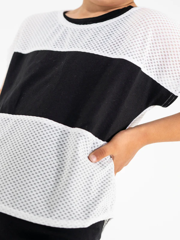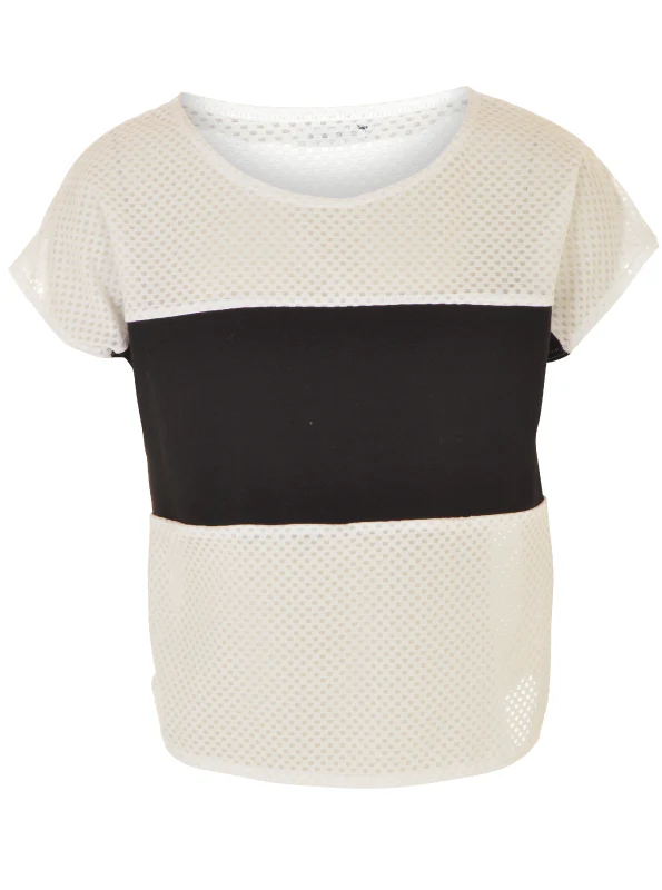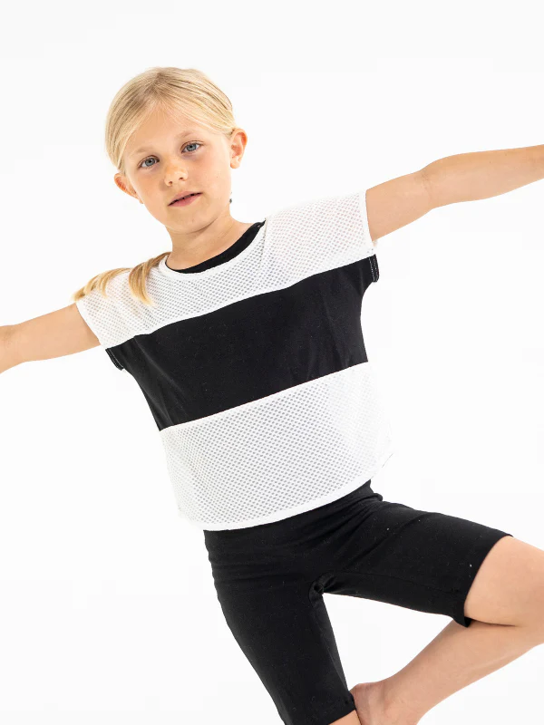 Småärmad topp med en horisontell detalj över bröstet – detaljen och kvaliteten ger den en sportig look. Tröjan är tillverkad i sportnät och bomull/Lycra-kvalitet. Skjortan i vitt/svart och svart/print är något transparent och kan bäras över Heldräkt NS-161 eller Catsuit NS-132. Finns i storlekarna 4-16 år [b]Varianter utgår ur lager. Reservationer görs i allmänhet för restorder.