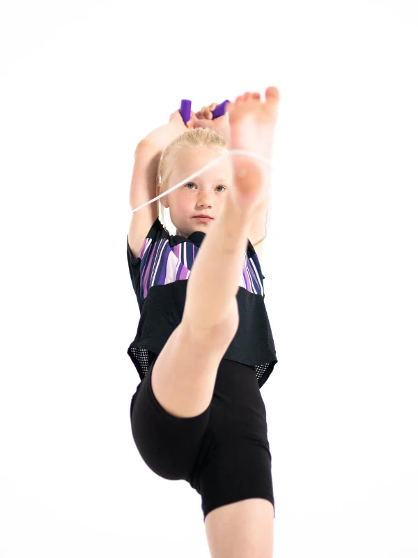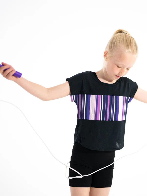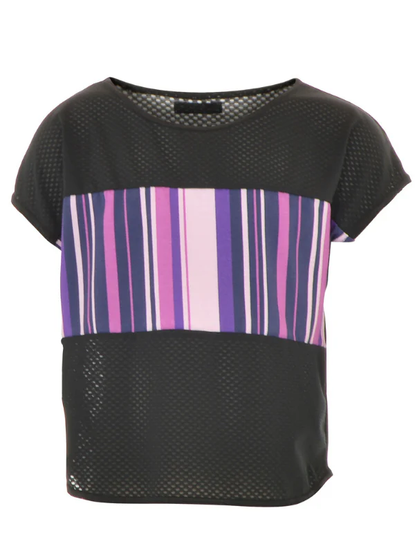 Småärmad topp med en horisontell detalj över bröstet – detaljen och kvaliteten ger den en sportig look. Tröjan är tillverkad i sportnät och bomull/Lycra-kvalitet. Skjortan i vitt/svart och svart/print är något transparent och kan bäras över Heldräkt NS-161 eller Catsuit NS-132. Finns i storlekarna 4-16 år [b]Varianter utgår ur lager. Reservationer görs i allmänhet för restorder.