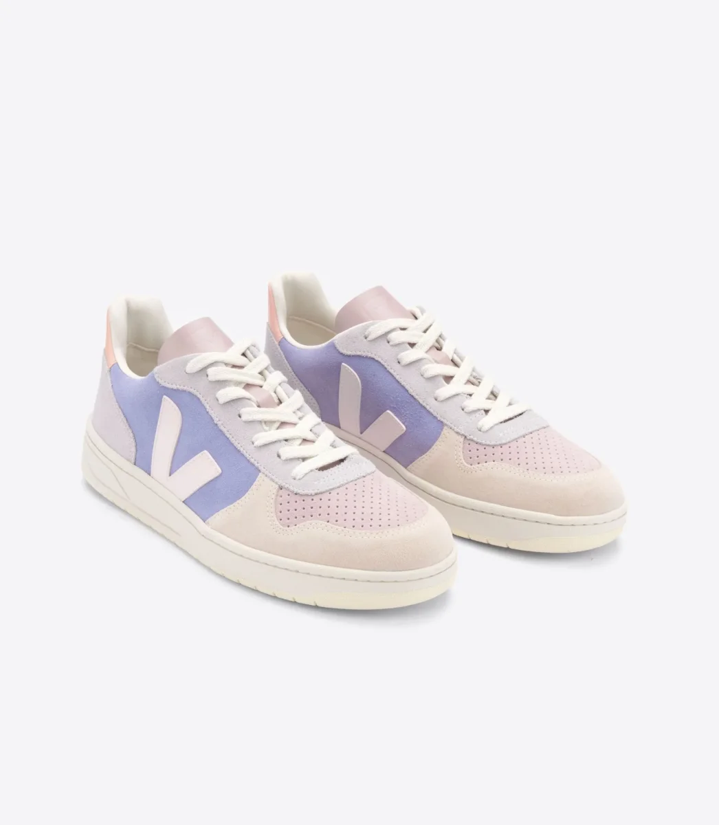 V-10 Lavendel från VEJA är en rosa, lila & lavendel-färgad mockaskinnsneaker med krämiga detaljer. Veja är rättvist producerad med fokus på hållbara material såsom kromfritt skinn, vildgummi, återvunnen bomull & återvunnen polyester. Veja V-10 påminner en aning om tidiga 90-talets klassiska basketkängor i vitt skinn. Skillnaden är bara att de är betydligt lägre, lite skönare & hur många gånger som helst sjysstare mot människor & miljö.
