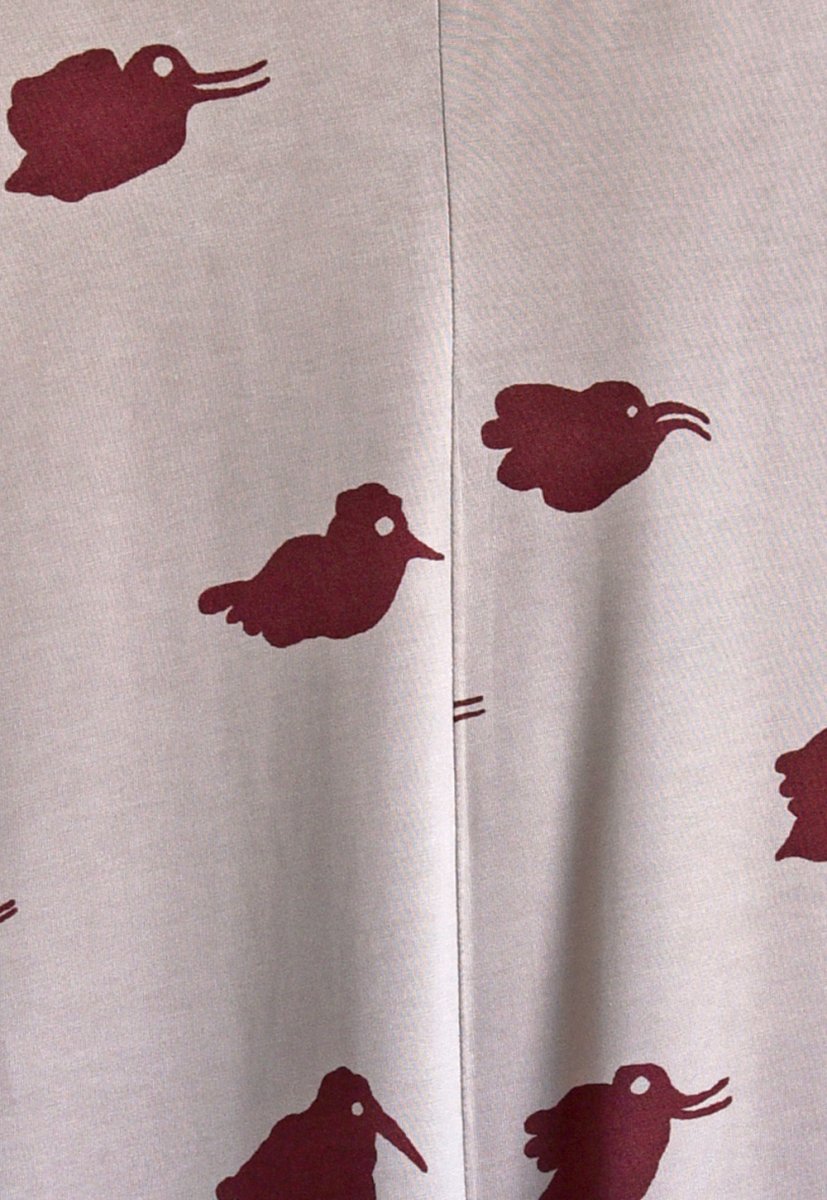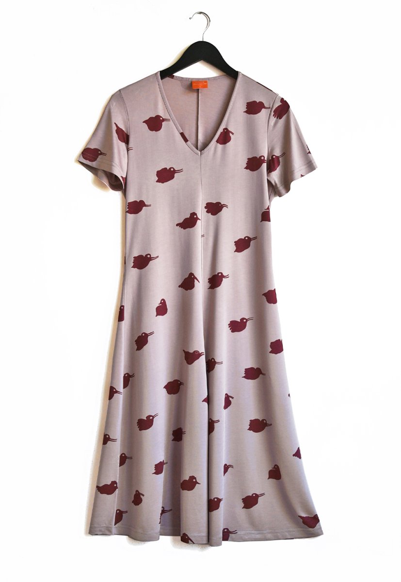 Den är v-ringad i fyra våder med bandkantad halsringning. Klänningen är relativt nätt upptill med midja och nedanför en klockad kjoldel. Den är vår längsta klänning och den slutar mitt på vaden eller under knät beroende på bärarens längd.