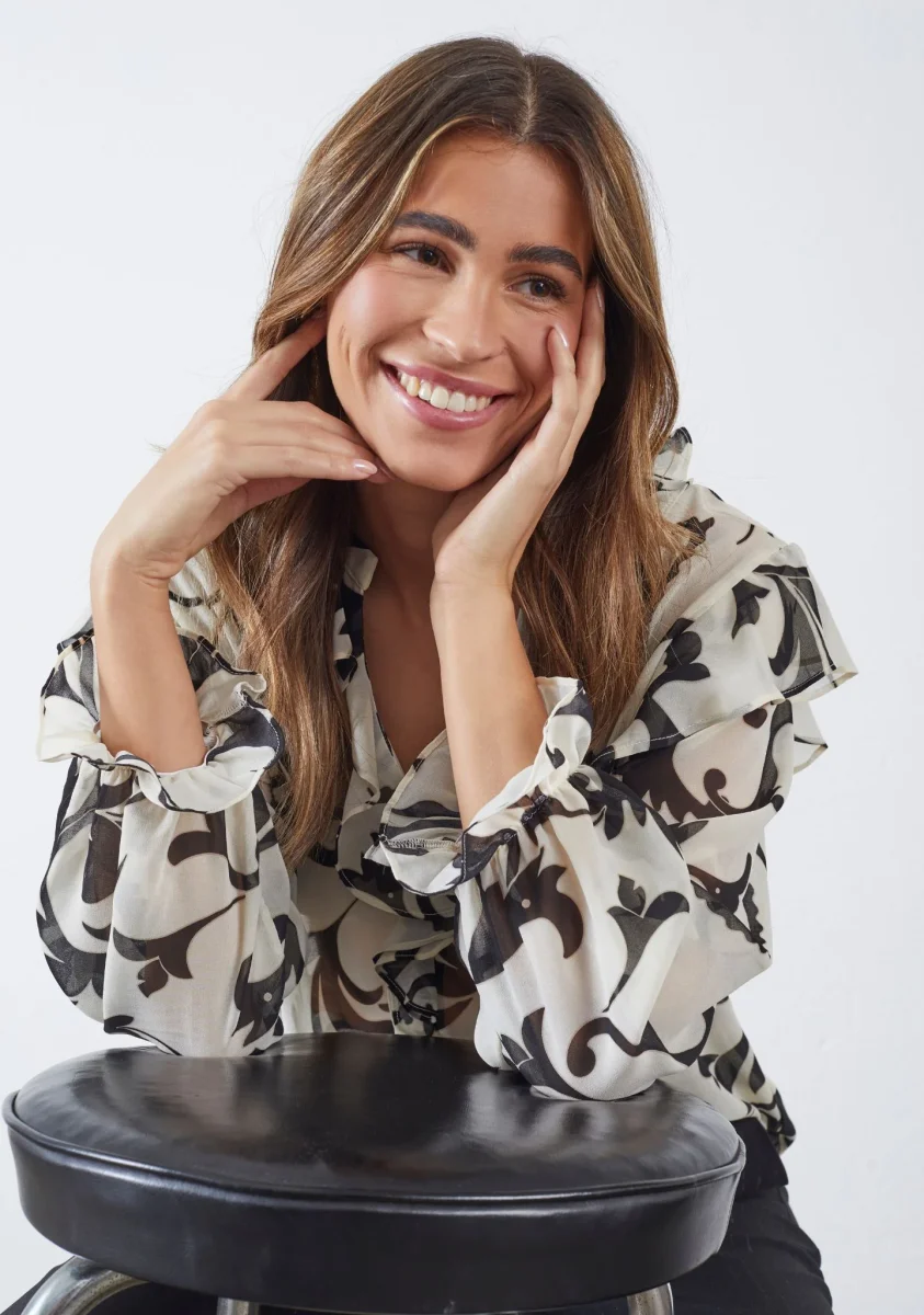 Vibse Flounce Blouse från I Say är en elegant och lekfull blus med iögonfallande mönster och romantiska volangdetaljer. Den har en mjuk, lätt transparent kvalitet som ger ett luftigt och feminint uttryck. Blusen har V-ringning, knappar framtill och volanger längs krage och ärmslut som skapar en vacker silhuett. Perfekt både till kontoret och till festligare tillfällen, lika snygg till jeans som till kostymbyxor.