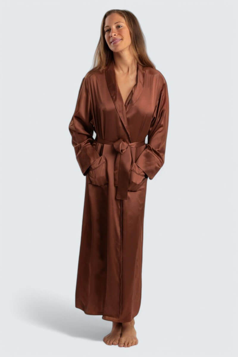 Sidenets naturliga temperaturreglerande egenskaper gör att morgonrocken känns behaglig året runt – sval på sommaren och värmande på vintern.