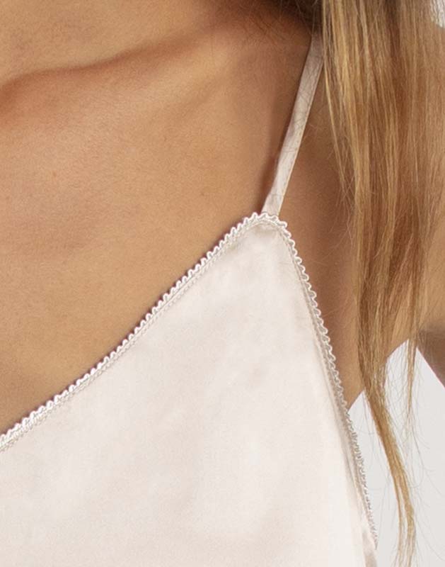 Upplev ultimat komfort och lyx med detta eleganta sidennattlinne i satin. Det högkvalitativa sidensatintyget ger en silkeslen känsla mot huden, samtidigt som det är lätt och andningsbart för en behaglig nattsömn. Med sin champagnefärgade nyans och stilrena design blir detta nattlinne en sofistikerad del av din nattgarderob.