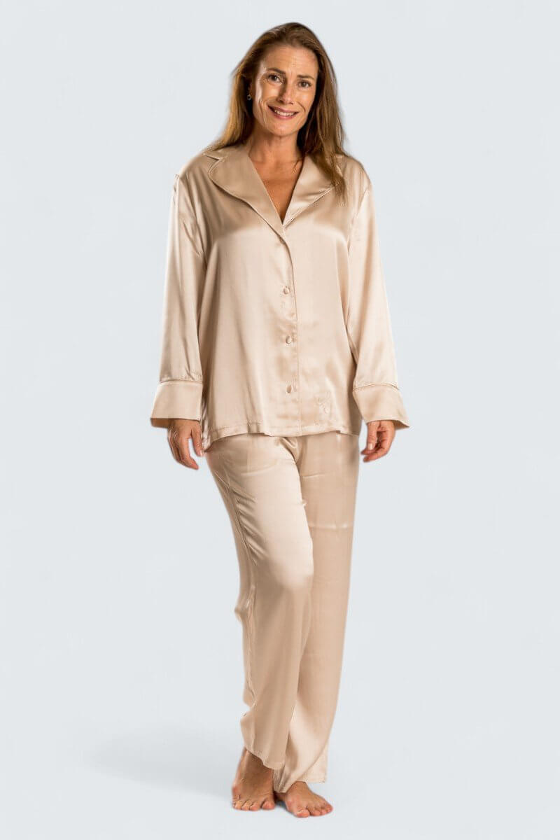 En exklusiv sidenpyjamas (överdel och underdel) med fina detaljer som silkesklädda knappar och passpoaler ton i ton. Underdelen har fickor att vila händerna i. Plagget ger en unik och lyxig känsla som är svårslagen. Bara att krypa in i pyjamasen och bara njuta av den sköna kvaliteten, perfekt för den som vill unna sig något extra och sätta guldkant på tillvaron.