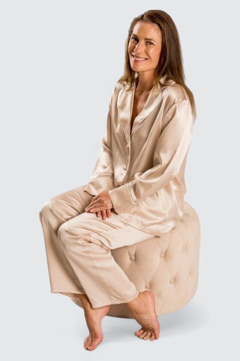 Den är gjord av 100% silke, Satin. Vikten är 16 Momme, det innebär ett kraftigt tyg med vackert fall. Eftersom vi sätter exklusivitet och kvalitet i första rummet och vill ge våra kunder det bästa valde vi att färga den i samma färg som den lyxigaste av alla drycker, Champagne.