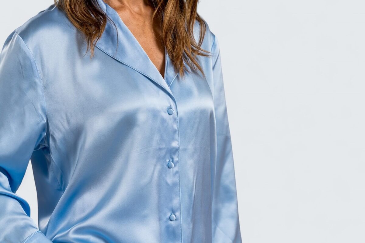 En exklusiv sidenpyjamas (överdel och underdel) med fina detaljer som silkesklädda knappar och passpoaler ton i ton. Underdelen har fickor att vila händerna i. Plagget ger en unik och lyxig känsla som är svårslagen. Bara att krypa in i pyjamasen och bara njuta av den sköna kvaliteten, perfekt för den som vill unna sig något extra och sätta guldkant på tillvaron.