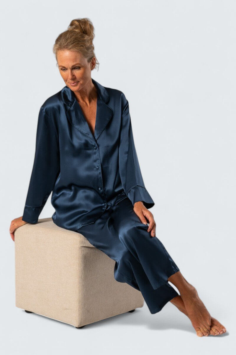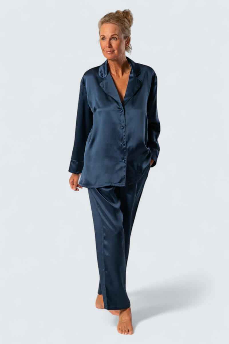 En exklusiv sidenpyjamas (överdel och underdel) med fina detaljer som silkesklädda knappar och passpoaler ton i ton. Underdelen har fickor att vila händerna i. Plagget ger en unik och lyxig känsla som är svårslagen. Bara att krypa in i pyjamasen och bara njuta av den sköna kvaliteten, perfekt för den som vill unna sig något extra och sätta guldkant på tillvaron.