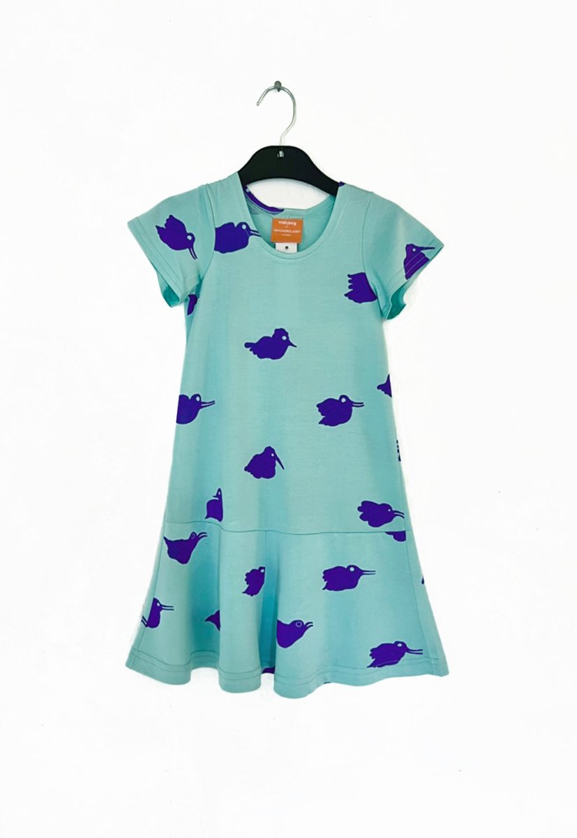 Vingklänning med korta vingärmar och volang i kjolen. Längd från axel till nederkant: stl 100 cl 57 cm, 110 cl 66 cm, 120 cl 73 cm, 130 cl 84 cm.