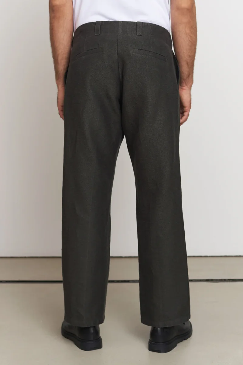 Waban Winter Linen Trousers från About Companions är ett par raka & vida herrbyxor som använder sig av en rejäl kanvasmix som består av 57% lin & 42% ekologisk bomull. Resultatet blir en lite luftigare & svalare kompis med total fokus på komfort. Detta tyg funkar bra året runt. Varmt nog på höst/vinter men fortfarande svalt nog på våren/sommaren. Tack vare att man färgen linet svart & bomullen olivgrönt får man till en otroligt snygg färg på denna variant.