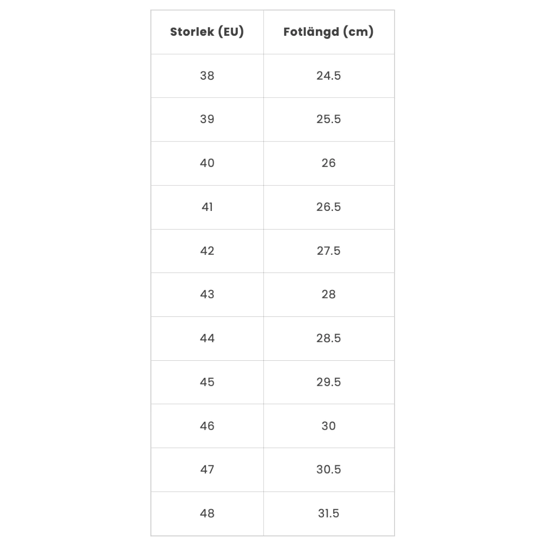 | Storlek (EU) | Fotlängd (cm) |