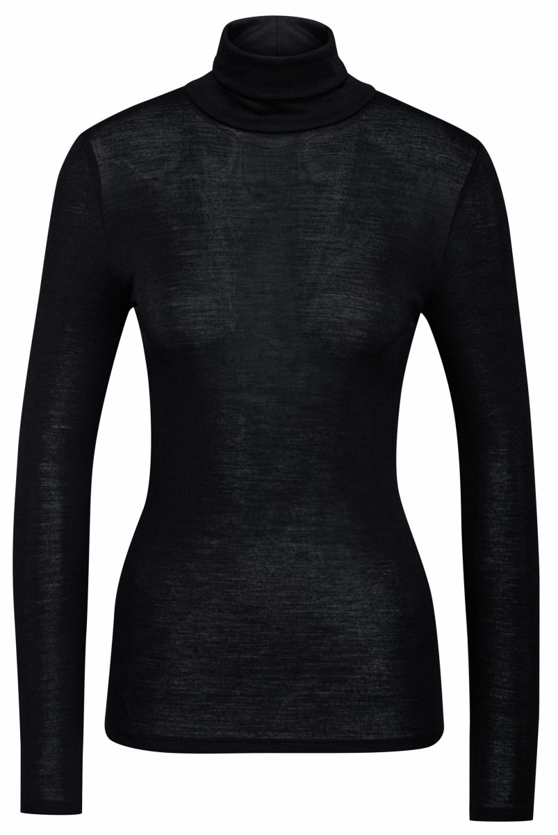 Lålångärmad tröja med polokrage som är extremt mjuk och smickrar även den mest känsliga huden. Ull kan absorbera fukt bra utan att själv kännas fuktig. Detta förhindrar att kroppstemperaturen sjunker och du har alltid en varm och torr känsla.